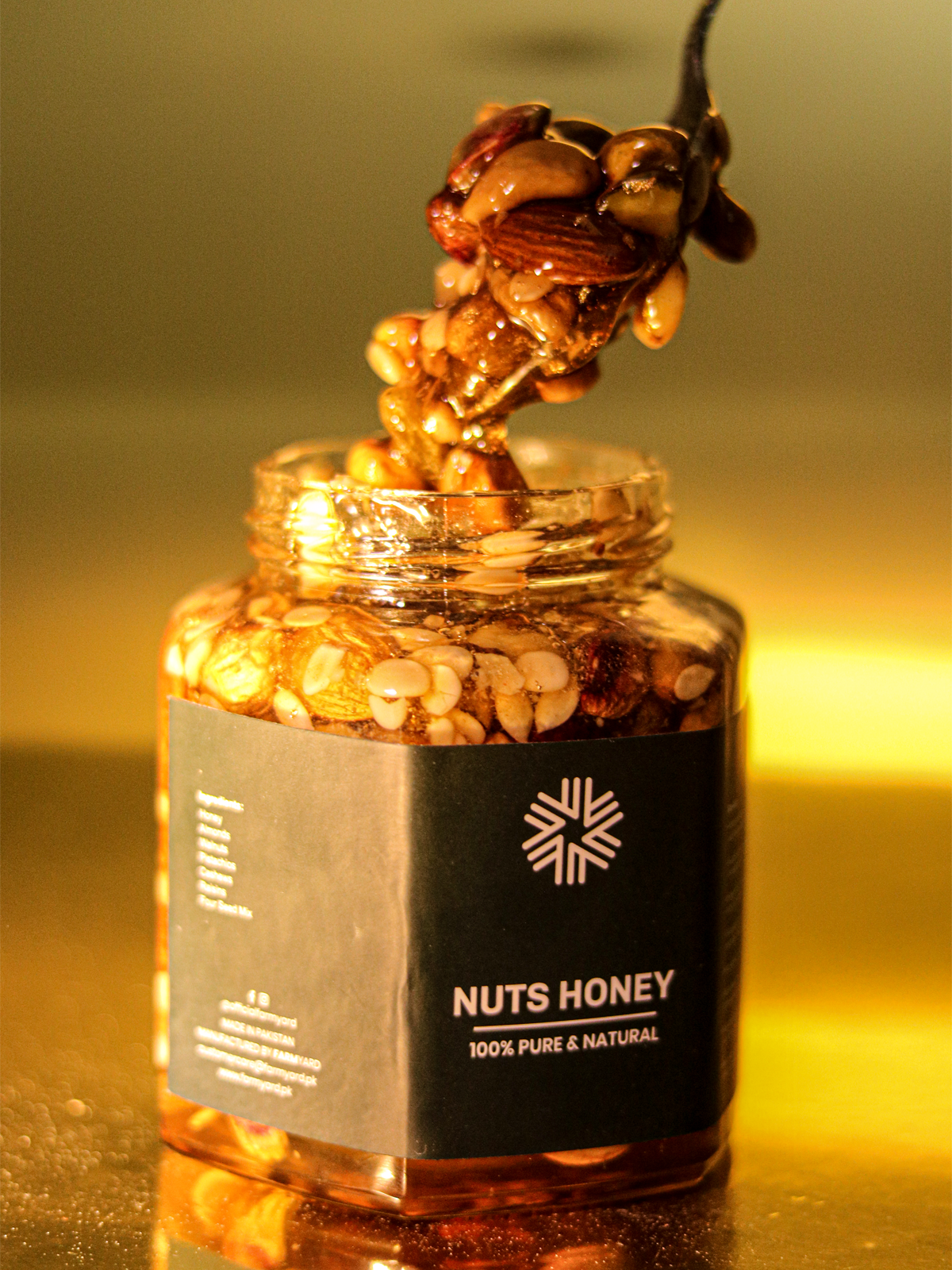 Indulge in our signature Nuts Honey, a harmonious fusion of nature's finest nuts, succulent dried fruits, and pure, golden honey. More than just a delicious treat, this gourmet blend is a powerhouse of nutrition designed to invigorate your body and delight your palate. Perfect for a healthy start, a satisfying snack, or an elegant addition to any dish.